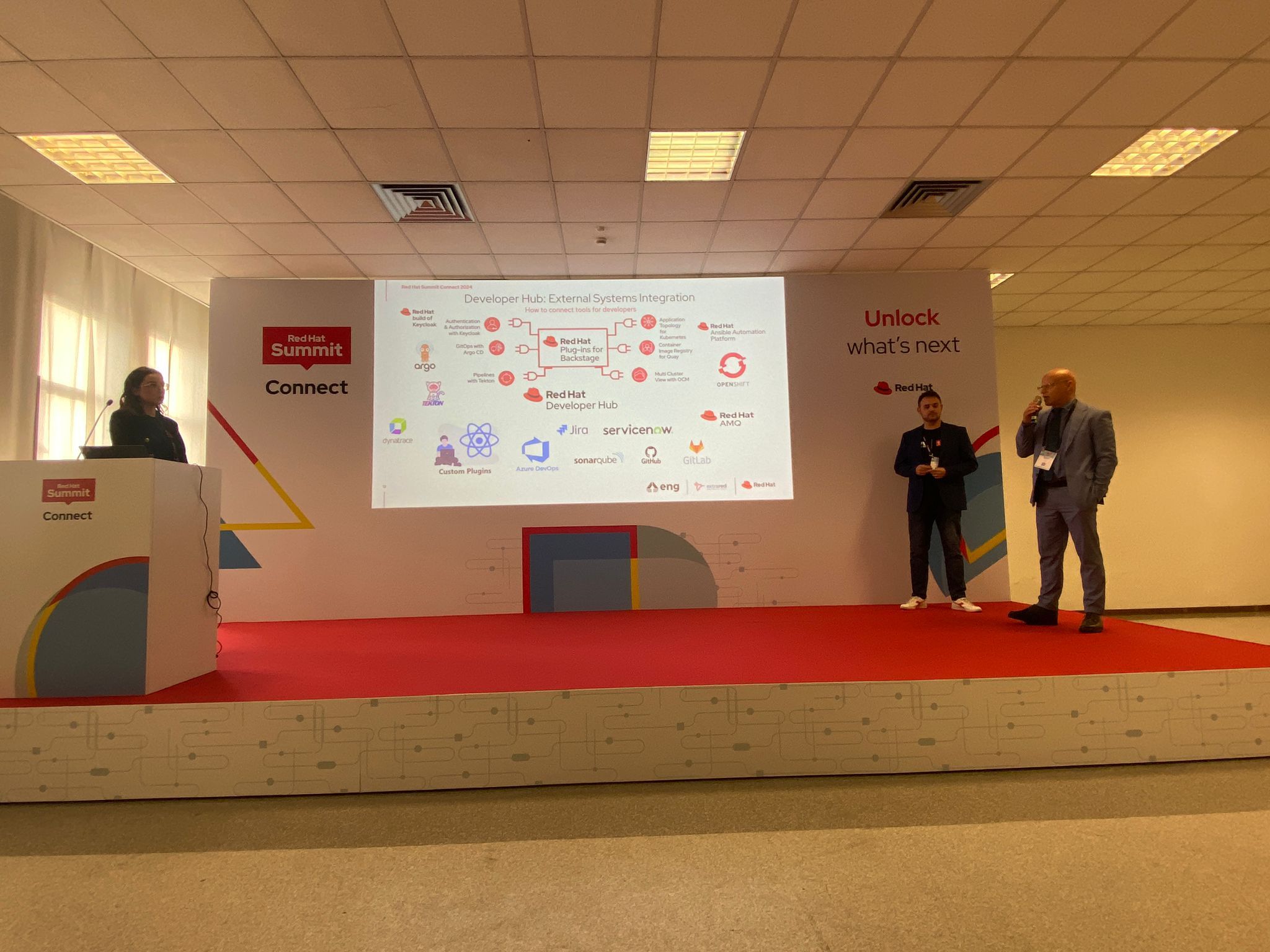 Durante la sessione pomeridiana, abbiamo avuto l'onore di ospitare la presentazione del progetto Internal Developer Platform di INPS, un'iniziativa innovativa che stiamo sviluppando in collaborazione con Red Hat e basata sul Red Hat Developer Hub. L'interesse suscitato dall'intervento ha confermato l'importanza di questo progetto nell'ambito dell'automazione e dell'ottimizzazione dei processi IT.
