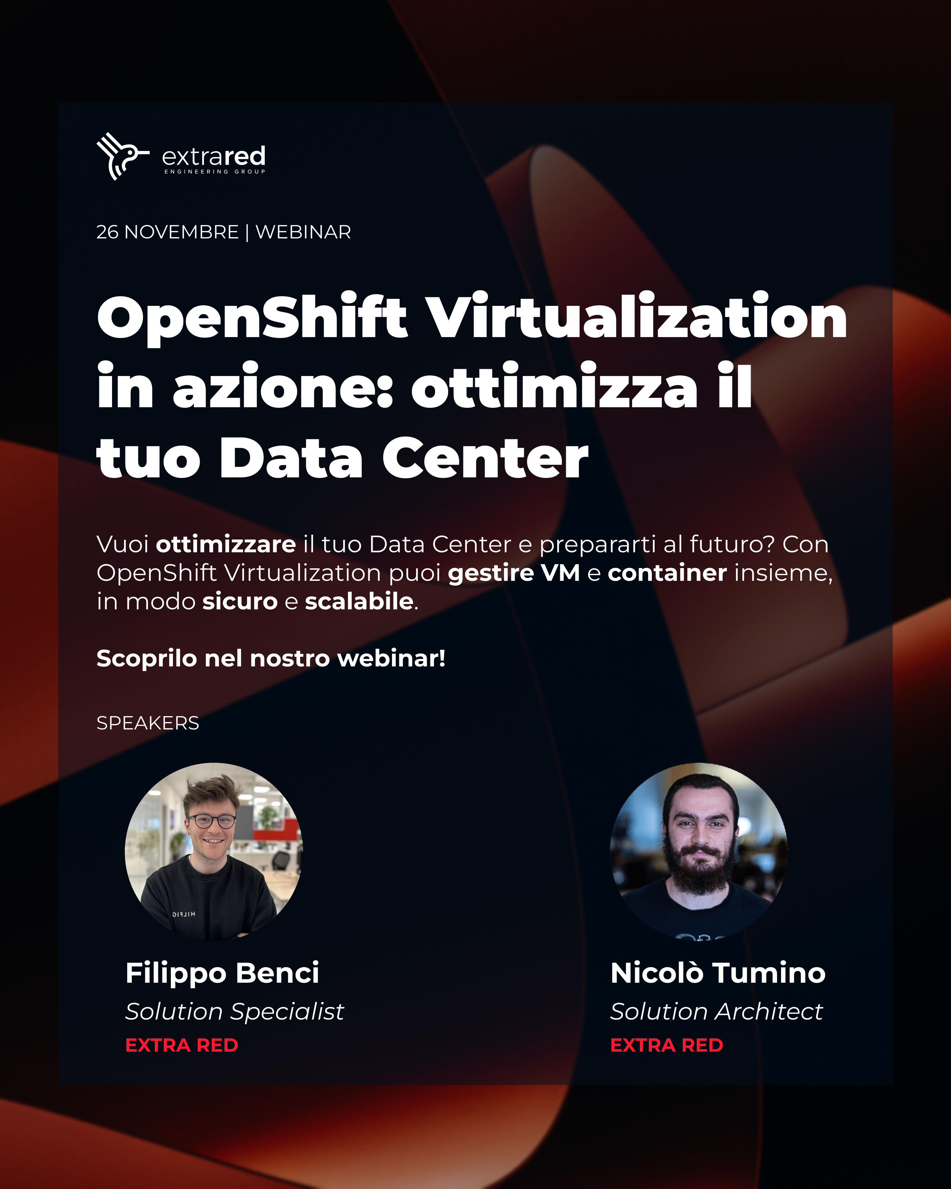 Durante il webinar, organizzato da Extra Red, ti mostreremo come semplificare la gestione dei tuoi Workload e ridurre i costi operativi in modo agile e sicuro grazie a Red Hat OpenShift Virtualization, disponibile nel nostro datacenter di Pont Saint Martin.
